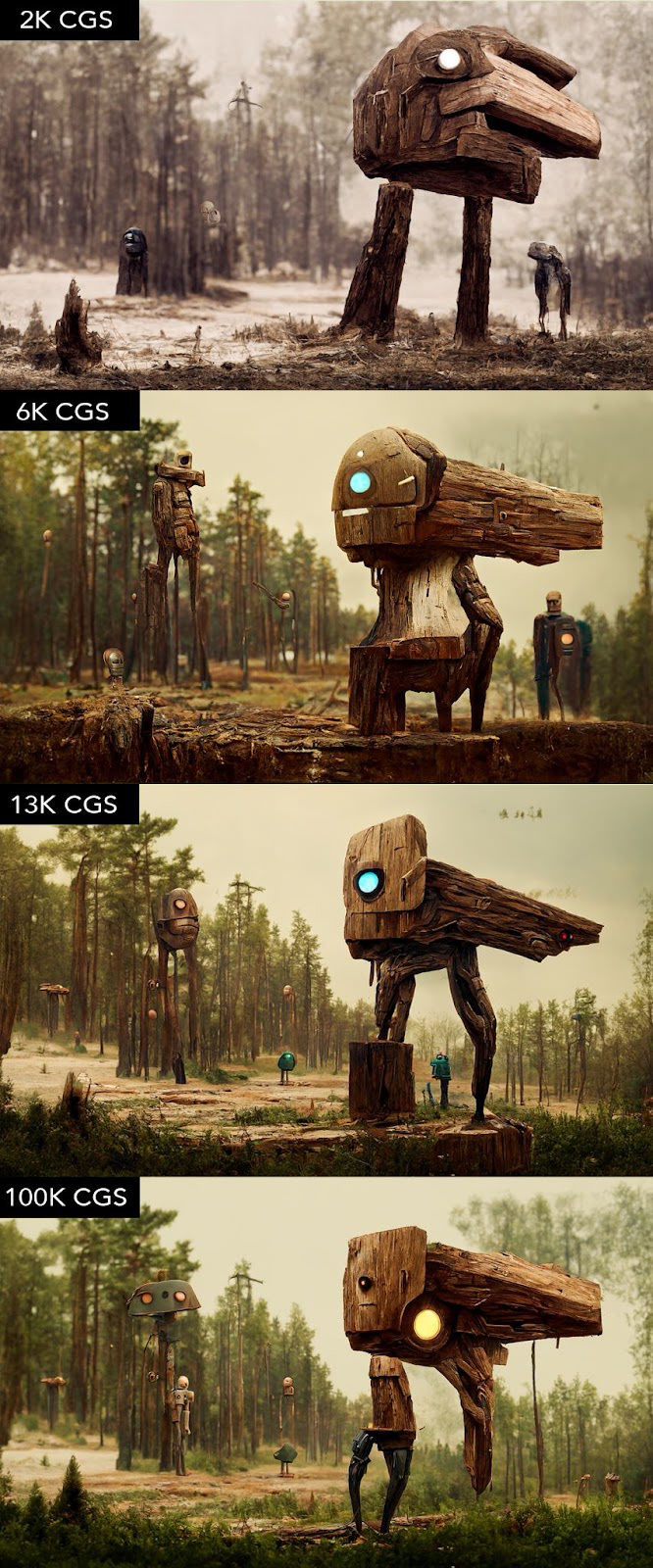 Steps parametresinin eta parametresiyle yakın bir ilişkisi vardır. Eta'yı 0 olarak ayarlarsanız, yalnızca 50-75 adımla iyi bir çıktı elde edebilirsiniz. Eta'yı 1.0'a ayarlamak, ideal olarak 250 ve üstü civarında daha yüksek adım sayımlarını destekler. eta'nın görüntü üzerinde ince ve öngörülemeyen bir etkisi vardır, bu nedenle bunun projelerinizi nasıl etkilediğini görmek için denemeniz gerekir.